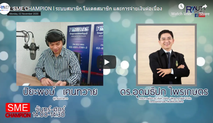 SME CHAMPION l ระบบสมาชิก โมเดลสมาชิก และการจ่ายเงินต่อเนื่อง ติดตามข่าวสารการส่งเสริม SME กับ ดร.อุดมธิปก ไพรเกษตร กรรมการผู้จัดการ บริษัท ดิจิทัลบิสิเนส คอนซัลท์ จำกัด และปิยะพงษ์ เคนทวาย ออกอากาศทุกวันจันทร์-ศุกร์ เวลา 14.00-14.30 น. . [2 พฤศจิกายน 2563] #SME_Champion, #วิทยุราชมงคลธัญบุรี, #SME, #เอสเอ็มอี, ...