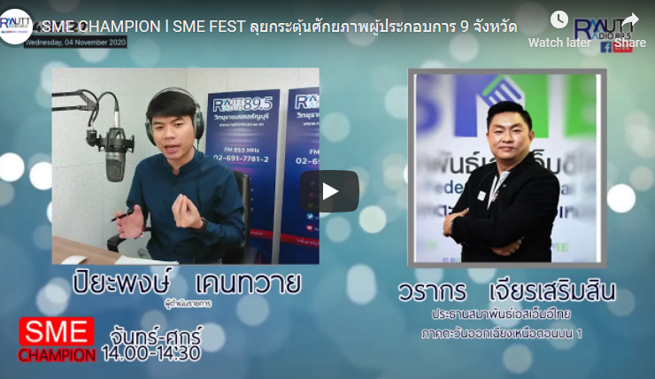 SME CHAMPION l SME FEST ลุยกระตุ้นศักยภาพผู้ประกอบการ 9 จังหวัด ในช่วง SME TALK วันนี้คุยกับ คุณวรากร เจียรเสริมสิน (ประธานสมาพันธ์ SME ภาคตะวันออกเฉียงเหนือตอนบน 1 และประธานสมาพันธ์ SME ภาคตะวันออกเฉียงเหนือ) ได้ประชาสัมพันธ์สำหรับการจัดงาน SME FEST เพื่อช่วยเหลือผู้ประกอบการในพื้นที่จาก 9 จังหวัดทั้งประเทศ ได้แก่ – นครราชสีมา กำหนดจัดงานระหว่าง 13-15 พ.ย. 63 – กาญจนบุรี กำหนดจัดงานระหว่าง 20-22 พ.ย. 63 ...