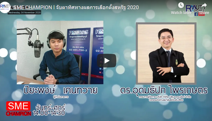 SME CHAMPION l จับตาทิศทางผลการเลือกตั้งสหรัฐ 2020 ติดตามข่าวสารการส่งเสริม SME กับ ดร.อุดมธิปก ไพรเกษตร กรรมการผู้จัดการ บริษัท ดิจิทัลบิสิเนส คอนซัลท์ จำกัด และปิยะพงษ์ เคนทวาย ออกอากาศทุกวันจันทร์-ศุกร์ เวลา 14.00-14.30 น. . [4 พฤศจิกายน 2563] #SME_Champion, #วิทยุราชมงคลธัญบุรี, #SME, #เอสเอ็มอี, ...