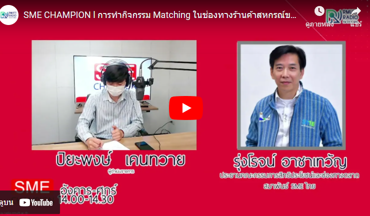 SME CHAMPION l การทำกิจกรรม Matching ในช่องทางร้านค้าสหกรณ์ของกรมส่งเสริมสหกรณ์ ในช่วง SME TALK วันนี้คุยกับคุณรุ่งโรจน์ อาชาเทวัญ (ประธานคณะกรรมการสิทธิประโยชน์และช่องทางตลาด สมาพันธ์เอสเอ็มอีไทย) [12 มกราคม 2565] ติดตามข่าวสารการสัมภาษณ์จากสมาพันธ์เอสเอ็มอีไทย ทางวิทยุราชมงคลธัญบุรี เวลา 14.20-14.30 น. ทุกวันพุธ ดำเนินรายการโดย ปิยะพงษ์ เคนทวาย #SME_Champion, #วิทยุราชมงคลธัญบุรี, #SME, #เอสเอ็มอี, ...