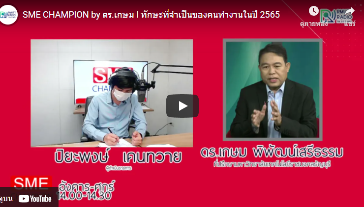 SME CHAMPION by ดร.เกษม l 3 ทักษะที่จำเป็นของคนทำงานในปี 2565 1. การทำงาน – ตื่นตัว ทันกระแส ปรับตัว และทันต่อเหตุการณ์ – ใฝ่รู้ พยายามหาความรู้เพิ่มโดยเฉพาะเรื่องเทคโนโลยี – คิดทั้งแง่บวกและแง่ลบ แต่ให้ลงมือทำในส่งที่กระตุ้นและส่งเสริมเรื่องแง่บวกให้มากๆ – รู้จักแบ่งงาน ทำในงานที่ถนัด ที่มีความเชี่ยวชาญ – อะไรดีแล้วอย่าไปฝืน การตัดสินใจไม่โลเล แบ่งการตัดสินใจเป็นเรื่องๆ 2. การสื่อสาร – ความสามารถในการสื่อสารต้องรู้จัก Focus ในเรื่องนั้นๆ ให้ตรงประเด็น – ต้องเป็นผู้ฟังและรู้จักการจับประเด็นให้ได้ – ต้องเป็นคนอ่านให้เร็ว ...