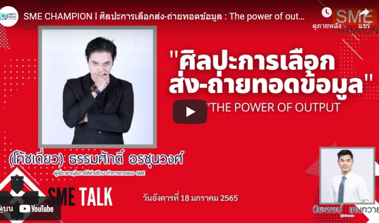 SME CHAMPION l ศิลปะการเลือกส่ง-ถ่ายทอดข้อมูล : The power of output ช่วง SME TALK พูดคุยกับ โค้ชเดี่ยว คุณธรรมศักดิ์ อรชุนวงศ์ (ผู้เชี่ยวชาญในการให้คำปรึกษาด้านการตลาดและการสร้างแบนด์) ติดตามข่าวสารการส่งเสริม SME กับ ดร.อุดมธิปก ไพรเกษตร กรรมการผู้จัดการ บริษัท ดิจิทัลบิสิเนส คอนซัลท์ จำกัด และปิยะพงษ์ เคนทวาย . [18 มกราคม 2565] #SME_Champion, #วิทยุราชมงคลธัญบุรี, #SME, #เอสเอ็มอี, ...