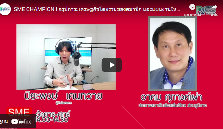 SME CHAMPION l สรุปภาวะเศรษฐกิจโดยรวมของสมาชิก และแผนงานในปี 2565 . ในช่วง SME TALK วันนี้คุยกับคุณอาคม สุภางค์เผ่า (ประธานสมาพันธ์เอสเอ็มอีไทย ส่วนภูมิภาค) . [22 ธันวาคม 2564] ติดตามข่าวสารการสัมภาษณ์จากสมาพันธ์เอสเอ็มอีไทย ทางวิทยุราชมงคลธัญบุรี เวลา 14.20-14.30 น. ทุกวันพุธ ดำเนินรายการโดย ปิยะพงษ์ เคนทวาย SME Champion, วิทยุราชมงคลธัญบุรี, SME, เอสเอ็มอี, สมาพันธ์เอสเอ็มอีไทย, ...