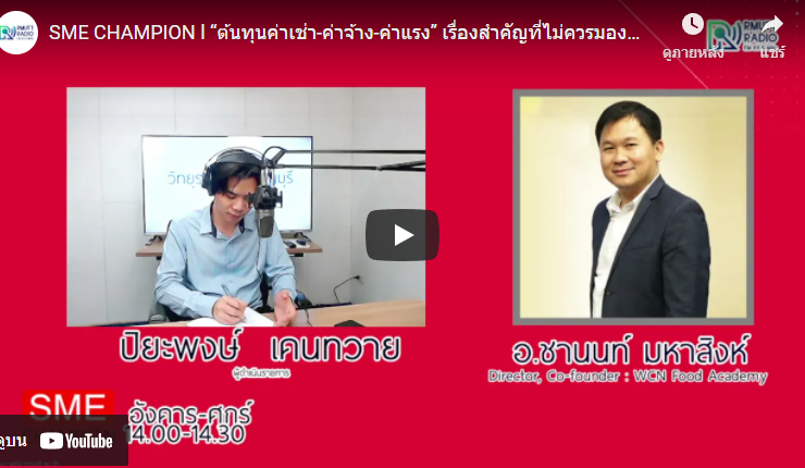 SME CHAMPION l “ต้นทุนค่าเช่า-ค่าจ้าง-ค่าแรง” เรื่องสำคัญที่ไม่ควรมองข้าม . ในช่วง SME TALK วันนี้คุยกับ อ.ชานนท์ มหาสิงห์ Director Co-Founder, WCN Food Academy . เวลา 14.20-14.30 น. ติดตามบทวิเคราะห์จาก อ.ชานนท์ มหาสิงห์ ได้ทุกวันศุกร์ ทางวิทยุราชมงคลธัญบุรี ดำเนินรายการโดย และปิยะพงษ์ เคนทวาย . [24 ธันวาคม 2564] SME Champion, วิทยุราชมงคลธัญบุรี, SME, เอสเอ็มอี, ...