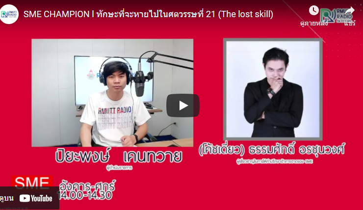 SME CHAMPION l ทักษะที่จะหายไปในศตวรรษที่ 21 (The lost skill) ช่วง SME TALK พูดคุยกับ โค้ชเดี่ยว คุณธรรมศักดิ์ อรชุนวงศ์ (ผู้เชี่ยวชาญในการให้คำปรึกษาด้านการตลาดและการสร้างแบนด์) ติดตามข่าวสารการส่งเสริม SME กับ ดร.อุดมธิปก ไพรเกษตร กรรมการผู้จัดการ บริษัท ดิจิทัลบิสิเนส คอนซัลท์ จำกัด และปิยะพงษ์ เคนทวาย . [28 ธันวาคม 2564] รับฟังรายการย้อนหลัง : SME Champion, วิทยุราชมงคลธัญบุรี, SME, เอสเอ็มอี, ...