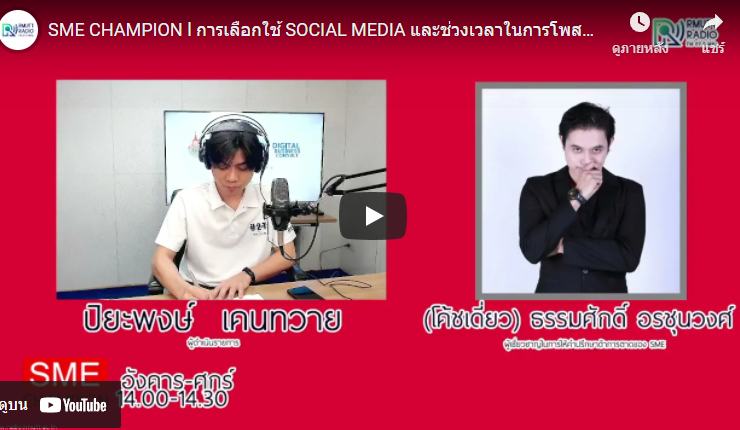 SME CHAMPION l การเลือกใช้ SOCIAL MEDIA และช่วงเวลาในการโพสต์ในปี 2565 . ช่วง SME TALK พูดคุยกับ โค้ชเดี่ยว คุณธรรมศักดิ์ อรชุนวงศ์ (ผู้เชี่ยวชาญในการให้คำปรึกษาด้านการตลาดและการสร้างแบนด์) . ติดตามข่าวสารการส่งเสริม SME กับ ดร.อุดมธิปก ไพรเกษตร กรรมการผู้จัดการ บริษัท ดิจิทัลบิสิเนส คอนซัลท์ จำกัด และปิยะพงษ์ เคนทวาย . [21 ธันวาคม 2564] SME Champion, วิทยุราชมงคลธัญบุรี, SME, เอสเอ็มอี, ...