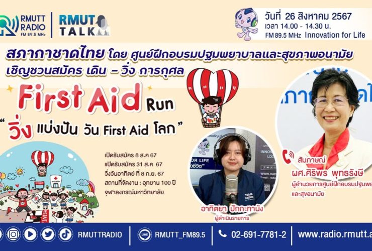 RMUT TALK l สภากาชาดไทย โดยศูนย์ฝึกอบรมปฐมพยาบาลและสุขภาพอนามัย เชิญชวนสมัครเดิน-วิ่ง การกุศล ภายใต้แนวคิด First Aid and Sport สัมภาษณ์ ผศ.ศิริพร พุทธรังษี ผู้อำนวยการศูนย์ฝึกอบรมปฐมพยาบาลและสุขอนามัย เชิญชวนผู้ชมรายการ ร่วมกิจกรรมวันปฐมพยาบาลโลก “First aid run วิ่งแบ่งปัน วันปฐมพยาบาลโลก ” วันที่ 8 กันยายน 2567 ณ อุทยาน 100 ปี จุฬาลงกรณ์มหาวิทยาลัย ขอเชิญชวนทุกท่านเข้าร่วมเป็นส่วนหนึ่งของกิจกรรมวันปฐมพยาบาลโลก ได้ทั้งสองกิจกรรมนะคะ ทั้งเพิ่มเติมในส่วนของกิจกรรม“ First aid run วิ่งแบ่งปัน ...