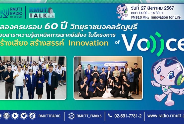 RMUT TALK l ฉลองครบรอบ 60 ปี วิทยุราชมงคลธัญบุรี มอบสาระความรู้เทคนิคการพากย์เสียง ในโครงการ “สร้างเสียง สร้างสรรค์ INNOVATION OF VOICE” สถานีวิทยุกระจายเสียง มหาวิทยาลัยเทคโนโลยีราชมงคลธัญบุรี FM 89.5 MHz ฉลองครบรอบ 60 ปี จัดโครงการสร้างเสียง สร้างสรรค์ INNOVATION OF VOICE ระหว่างวันที่ 22 -23 สิงหาคม 2567 ณ ห้องประชุม Ballroom ศูนย์นวัตกรรมและความรู้ มทร.ธัญบุรี ชั้น 7 ศูนย์การค้าบางซื่อจังชั่น ...