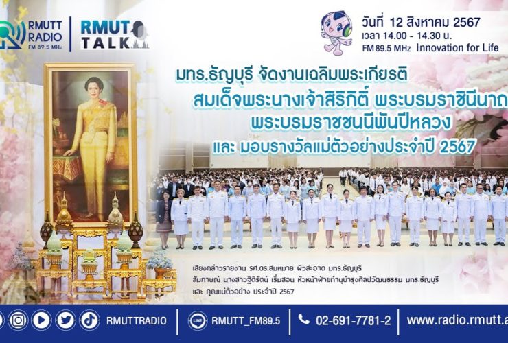 RMUT TALK l มทร.ธัญบุรี จัดงานเฉลิมพระเกียรติสมเด็จพระนางเจ้าสิริกิติ์ พระบรมราชินีนาถ พระบรมราชชนนีพันปีหลวง และ มอบรางวัลแม่ตัวอย่างประจำปี 2567 สัมภาษณ์ รศ.ดร.สมหมาย ผิวสะอาด มทร.ธัญบุรี นางสาวฐิติรัตน์ เริ่มสอน เจ้าหน้าที่บริหารงานทั่วไป ชำนาญการ หัวหน้าฝ่ายทำนุบำรุงศิลปวัฒนธรรม กองพัฒนานักศึกษา มทร.ธัญบุรี คุณแม่ตัวอย่าง ประจำปี 2567 มหาวิทยาลัยเทคโนโลยีราชมงคลธัญบุรี จัดงานเฉลิมพระเกียรติสมเด็จพระนางเจ้าสิริกิติ์ พระบรมราชินีนาถ พระบรมราชชนนีพันปีหลวง เนื่องในโอกาสมหามงคลเฉลิมพระชนมพรรษา 92 พรรษา และ มอบรางวัลแม่ตัวอย่างประจำปี 2567 เมื่อวันศุกร์ที่ 9 สิงหาคม 2567 มหาวิทยาลัยเทคโนโลยีราชมงคลธัญบุรี จัดงานเฉลิมพระเกียรติสมเด็จพระนางเจ้าสิริกิติ์ ...