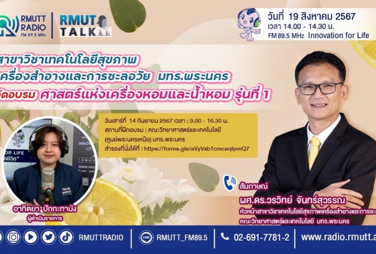 RMUT TALK l สาขาวิชาเทคโนโลยีสุขภาพ เครื่องสำอางและการชะลอวัย มทร.พระนคร จัดอบรมศาสตร์แห่งเครื่องหอมและน้ำหอม รุ่นที่ 1 สัมภาษณ์ ผศ.ดร.วรวิทย์ จันทร์สุวรรณ หัวหน้าสาขาวิชาเทคโนโลยีสุขภาพ เครื่องสำอางและการชะลอวัย คณะวิทยาศาสตร์และเทคโนโลยี มทร.พระนคร สาขาวิชาเทคโนโลยีสุขภาพ เครื่องสำอางและการชะลอวัย มทร.พระนคร จัดอบรมศาสตร์แห่งเครื่องหอมและน้ำหอม รุ่นที่ 1 กำหนดการ วันเสาร์ที่ 14 กันยายน 2567 เวลา : 9.00 – 16.30 น. จำนวนคน : 30 คน ค่าสมัคร : 2,000 ...