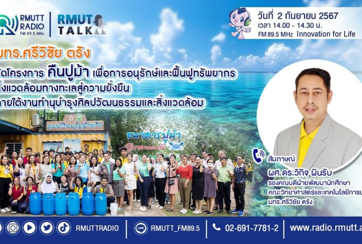 RMUT TALK l มทร.ศรีวิชัย ตรัง จัดโครงการคืนปูม้าเพื่อการอนุรักษ์และฟื้นฟูทรัพยากรสิ่งแวดล้อมทางทะเลสู่ความยั่งยืน ภายใต้งานทำนุบำรุงศิลปวัฒนธรรมและสิ่งแวดล้อม สัมภาษณ์ ผู้ช่วยศาสตราจารย์ ดร.วิกิจ ผินรับ รองคณบดีฝ่ายพัฒนานักศึกษา คณะวิทยาศาสตร์และเทคโนโลยีการประมง โครงการคืนปูม้าเพื่อการอนุรักษ์และฟื้นฟูทรัพยากรสิ่งแวดล้อมทางทะเลสู่ความยั่งยืน ภายใต้งานทำนุบำรุงศิลปวัฒนธรรมและสิ่งแวดล้อม ภาคการศึกษาที่ 1/2567 คณะวิทยาศาสตร์และเทคโนโลยีการประมง จัดโครงการคืนปูม้าเพื่อการอนุรักษ์และฟื้นฟูทรัพยากรสิ่งแวดล้อมทางทะเลสู่ความยั่งยืน ภายใต้งานทำนุบำรุงศิลปวัฒนธรรมและสิ่งแวดล้อม ภาคการศึกษาที่ 1/2567 โดยมี คณาจารย์ นักศึกษา และบุคลากรในสังกัดคณะวิทยาศาสตร์และเทคโนโลยีการประมง คณะวิศวกรรมศาสตร์และเทคโนโลยี และวิทยาลัยการโรงแรมและการท่องเที่ยว เข้าร่วมกิจกรรมดังกล่าว ซึ่งได้รับเกียรติจาก ผู้ช่วยศาสตราจารย์ ดร.วิกิจ ผินรับ หัวหน้าโครงการการจัดการและส่งเสริมธนาคารปูม้าแบบมีส่วนร่วมเพื่อสร้างคุณภาพชีวิตที่ดีของชุมชนในจังหวัดตรังและกระบี่ และรองคณบดีฝ่ายพัฒนานักศึกษา คณะวิทยาศาสตร์และเทคโนโลยีการประมง เป็นวิทยากรบรรยายให้ความรู้เกี่ยวกับวิธีการปล่อยปูม้าลงสู่ทะเล เมื่อวันพุธที่ 17 กรกฎาคม ...