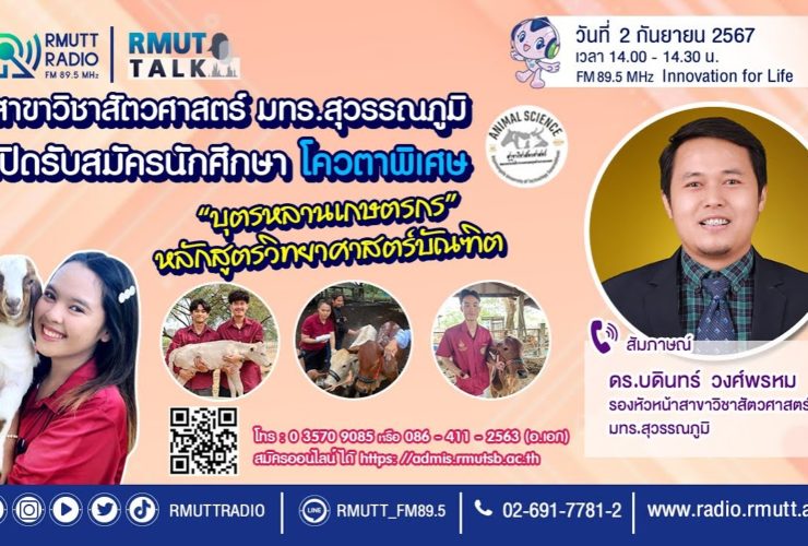 RMUT TALK l สาขาวิชาสัตวศาสตร์ มทร.สุวรรณภูมิเปิดรับสมัครนักศึกษา โควตาพิเศษ บุตรหลานเกษตรกร ในหลักสูตรวิทยาศาสตร์บัณฑิต สัมภาษณ์ ดร.บดินทร์ วงศ์พรหม รองหัวหน้าสาขาวิชาสัตวศาสตร์ มทร.สุวรรณภูมิ สาขาวิชาสัตวศาสตร์ มทร.สุวรรณภูมิเปิดรับสมัครนักศึกษา โควตาพิเศษ บุตรหลานเกษตรกร ในหลักสูตรวิทยาศาสตร์บัณฑิต – ลูกหรือหลานเกษตรกร สมัครได้ หรือคนในครอบครัวเป็นเกษตรกร ก็สมัครได้ สมัครฟรี ไม่ใช้พอร์ท เกรด 2.0 ขึ้นไป – สายศิลป์ – คำนวณ – ภาษา – อื่นๆ ก็สมัครได้ – รับผู้จบ ม.6 ...