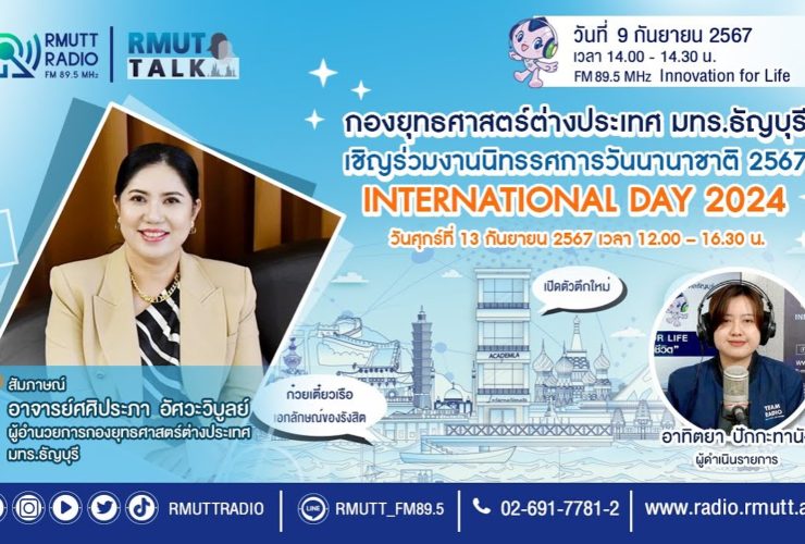 RMUT TALK l กองยุทธศาสตร์ต่างประเทศ มทร.ธัญบุรี เชิญร่วมงานนิทรรศการวันนานาชาติ 2567 International Day 2024 สัมภาษณ์ อาจารย์ศศิประภา อัศวะวิบูลย์ ผู้อำนวยการกองยุทธศาสตร์ต่างประเทศ มทร.ธัญบุรี มหาวิทยาลัยเทคโนโลยีราชมงคลธัญบุรี ได้เล็งเห็นถึงความสำคัญของมิติความเป็นนานาชาติ (Internationalization) ในการพัฒนาศักยภาพและส่งเสริมสร้างบรรยากาศความเป็นสากลขึ้นในมหาวิทยาลัยเพื่อให้สามารถปรับตัวรองรับตลาดแรงงานทั้งภายในและภายนอกประเทศได้ ความเป็นนานาชาติ และกระบวนการบูรณาการความเป็นนานาชาติ เปิดโอกาสให้นักศึกษาไทยได้ใช้ภาษาต่างประเทศในชีวิตประจำวัน ฝึกทักษะการใช้ภาษาต่างประเทศในการเรียน และการทำกิจกรรมต่าง ๆ ในมหาวิทยาลัย ขอเชิญ นักศึกษา เข้าร่วมงานนิทรรศการวันนานาชาติ ประจำปี 2567 International Day 2024 ในวันศุกร์ ที่ 13 กันยายน 2567 ณ ...
