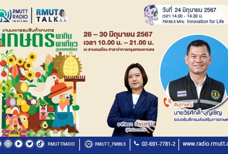 RMUT TALK l กรมส่งเสริมการเกษตรชวนร่วมงานมหกรรมสินค้าเกษตรของกระทรวงเกษตรและสหกรณ์ “เกษตรพากิน พาเที่ยว @ลานคนเมือง” สัมภาษณ์ สัมภาษณ์ นายวีรศักดิ์ บุญเชิญ รองอธิบดีกรมส่งเสริมการเกษตร กระทรวงเกษตรและสหกรณ์ดำเนินการขับเคลื่อนนโยบาย “ตลาดนำ นวัตกรรมเสริม เพิ่มรายได้” มีวัตถุประสงค์เพื่อจัดแสดงและจำหน่ายสินค้าเกษตรปลอดภัย เกษตรอินทรีย์ รวมถึงสินค้า อัตลักษณ์ท้องถิ่น นำเสนอสินค้าที่ใช้เทคโนโลยีและนวัตกรรมในการผลิต รวมถึงสินค้าเกษตรคุณภาพมาตรฐานด้านการเกษตร ส่งเสริมกิจกรรมภาคการเกษตร ประชาสัมพันธ์การท่องเที่ยว และเป็นการกระตุ้นเศรษฐกิจ โดยมุ้งเน้นการสร้างรายได้ให้แก่เกษตรกร ส่งเสริมการประกอบอาชีพเสริม เชื่อมโยงการตลาด โดยใช้กลไกการสร้างความร่วมมือระหว่างภาครัฐ ภาคเอกชน และภาคประชาชน สร้างโอกาสให้เกษตรกร วิสาหกิจชุมชน สถาบันเกษตรกร เพิ่มช่องทางการกระจายสินค้าเกษตร เชื่อมโยงภาคผลิตสู่การตลาดแบบครบวงจร ตอบโจทย์ความต้องการของตลาดได้อย่างมีประสิทธิภาพ ก่อให้เกิดเกิดการซื้อขายอย่างต่อเนื่อง และสร้างรายได้ที่แน่นอนให้แก่เกษตรกร “เกษตรพากิน ...