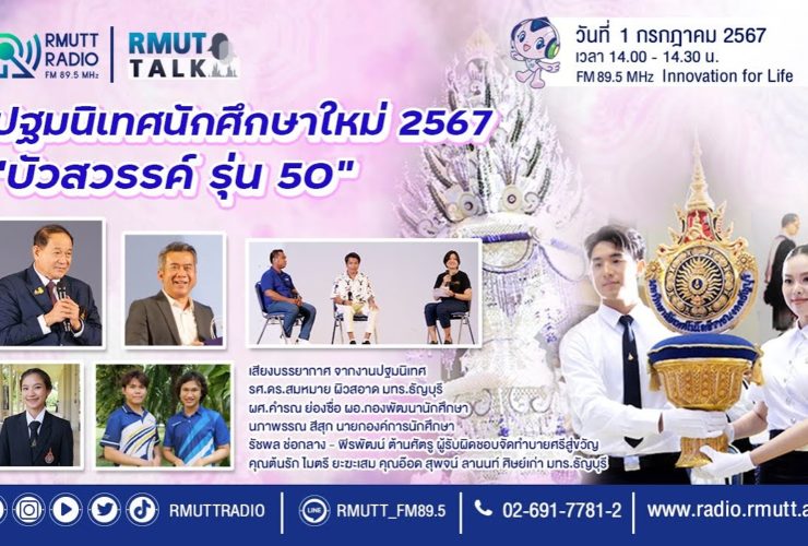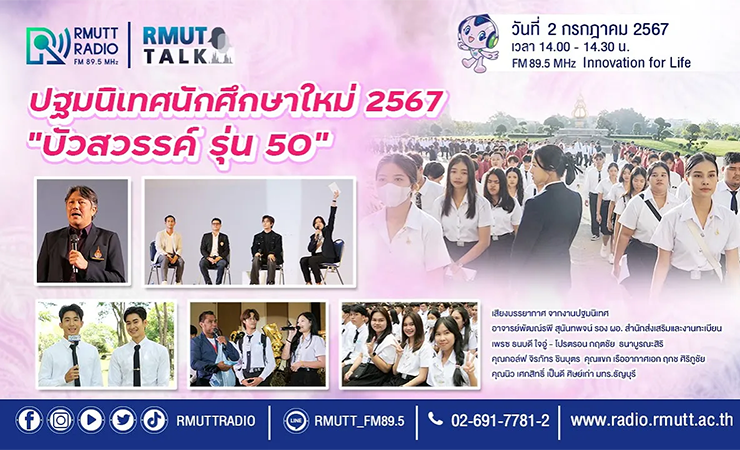 RMUT TALK l ปฐมนิเทศนักศึกษาใหม่ ประจำปีการศึกษา 2567 “บัวสวรรค์รุ่น 50” อาจารย์พัฒณ์รพี สุนันทพจน์ รองผู้อำนวยการสำนักส่งเสริมและงานทะเบียน น้องเพรซ ธนบดี ใจอู่ คณะบริหารธุรกิจ ผู้ถือธงมหาวิทยาลัย น้องโปรตรอน กฤตชัย ธนาบูรณะสิริ คณะครุศาสตร์อุตสาหกรรม ผู้อัญเชิญตรามหาวิทยาลัย งานเสวนา คุณกอล์ฟ จิรภัทร ชินบุตร ศิษย์เก่าคณะวิศวกรรมศาสตร์ คุณแขก เรืออากาศเอก ฤกช ศิริภูชัย ศิษย์เก่าคณะสถาปัตยกรรมศาสตร์ คุณนิว เศกสิทธิ์ เป็นดี ศิษย์เก่าคณะเทคโนโลยีสื่อสารมวลชน มทร.ธัญบุรี จัดกิจกรรมปฐมนิเทศนักศึกษาใหม่ประจำปีการศึกษา 2567 “บัวสวรรค์ รุ่น ...
