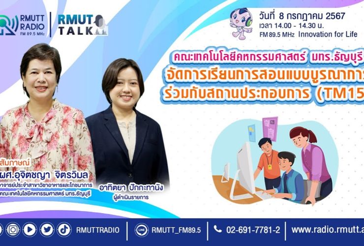 RMUT TALK l คณะเทคโนโลยีคหกรรมศาสตร์ มทร.ธัญบุรี การจัดการเรียนการสอนแบบบูรณาการร่วมกับสถานประกอบการ (TM15) สัมภาษณ์ ผู้ช่วยศาสตราจารย์ อุจิตชญา จิตรวิมล อาจารย์ประจำสาขาวิชาอาหารและโภชนาการ คณะเทคโนโลยีคหกรรมศาสตร์ มทร.ธัญบุรี การเปลี่ยนแปลงของสถาบันอุดมศึกษาทั่วโลกรวมถึงประเทศไทย มีความพยายามในการพัฒนาและปรับตัวเพื่อรองรับกับสภาพการแข่งขัน การจะปรับตัวให้สอดรับกับแนวโน้มอนาคต จำเป็นต้องศึกษาคาดการณ์แนวโน้มอนาคต เพื่อเป็นกรอบในการปรับทิศทางพัฒนาอุดมศึกษาให้สอดรับกับอนาคตที่จะมาถึง จึงมีการจัดการเรียนการสอนแบบบูรณาการ (WiL) ในรูปแบบของ TM-15 ของหลักสูตรคหกรรมศาสตรบัณฑิต คณะเทคโนโลยีคหกรรมศาสตร์ มทร.ธัญบุรี เพื่อพัฒนาการเรียนการสอนให้มีประสิทธิภาพและตอบโจทย์สถานประกอบการ ให้นักศึกษาจบมาแล้วมีสถานประกอบการรองรับการทำงาน รับฟังได้ทาง FM 89.5 MHz. Innovation for Life วิทยุราชมงคลธัญบุรี ออกอากาศ วันที่ 9 กรกฎาคม ...
