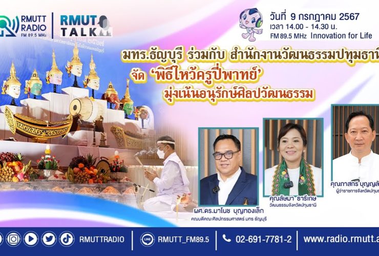 RMUT TALK l มทร.ธัญบุรี ร่วมกับสำนักงานวัฒนธรรมปทุมธานี จัด ‘พิธีไหว้ครูปี่พาทย์’ มุ่งเน้นอนุรักษ์ศิลปวัฒนธรรม สัมภาษณ์ คุณภาสกร บุญญลักษม์ ผู้ว่าราชการจังหวัดปทุมธานี คุณลัษมา ธารีเกษ วัฒนธรรมจังหวัดปทุมธานี ผศ.ดร.มาโนช บุญทองเล็ก คณบดีคณะศิลปกรรมศาสตร์ มทร ธัญบุรี มทร.ธัญบุรี ร่วมกับสำนักงานวัฒนธรรมปทุมธานี จัด ‘พิธีไหว้ครูปี่พาทย์’ มุ่งเน้นอนุรักษ์ศิลปวัฒนธรรม เมื่อวันที่ 27 มิถุนายน 2567 จังหวัดปทุมธานี โดยสำนักงานวัฒนธรรมจังหวัดปทุมธานี ร่วมกับ คณะศิลปกรรมศาสตร์ มหาวิทยาลัยเทคโนโลยีราชมงคลธัญบุรี (มทร.ธัญบุรี) จัดพิธีไหว้ครูปี่พาทย์จังหวัดปทุมธานี ภายใต้โครงการมหกรรมวิถีวัฒนธรรมปทุมธานี เพื่ออนุรักษ์ศิลปวัฒนธรรม ณ ห้องประชุมสงค์ธนาพิทักษ์ ...