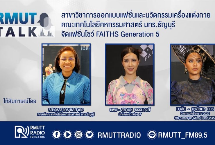 RMUT TALK l คณะเทคโนโลยีคหกรรมศาสตร์ มทร.ธัญบุรี จัดแฟชั่นโชว์ FAITHS Generation 5 สัมภาษณ์ รศ.ดร.สาคร ชลสาคร คณบดีคณะเทคโนโลยีคหกรรมศาสตร์ มทร.ธัญบุรี แพม – สุชานุช ธรรมวงศ์ นักแสดงจากช่อง7 มาลัย – มาลัยกะ คาร มิสแกรนด์เชียงราย 2022/ 5th runner up Miss Grand 2022 ตัวแทนนักศึกษา สาขาวิชาการออกแบบแฟชั่นและนวัตกรรมเครื่องแต่งกาย สาขาวิชาการออกแบบแฟชั่นและนวัตกรรมเครื่องแต่งกาย คณะเทคโนโลยีคหกรรมศาสตร์ มทร.ธัญบุรี จัดแสดงผลงานปริญญานิพนธ์ FAITHS Generation 5 ...