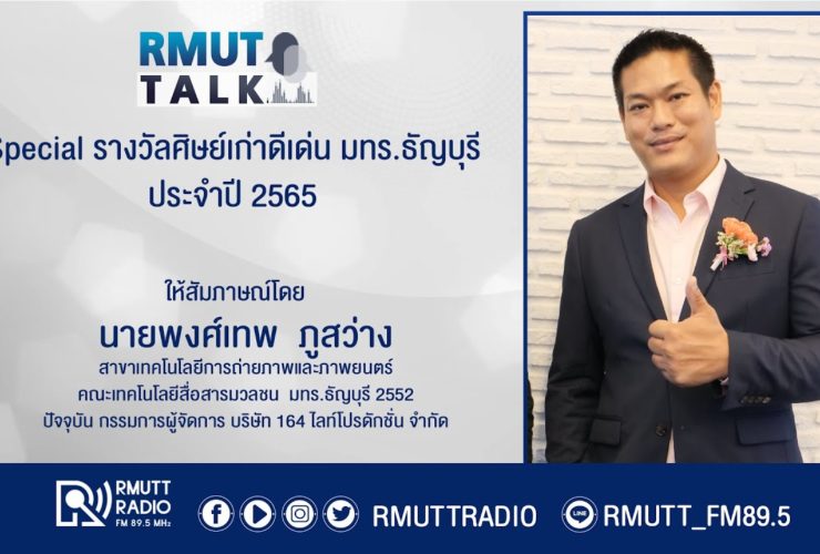 RMUT TALK l Special รางวัลศิษย์เก่าดีเด่น มทร.ธัญบุรี ประจำปี 2565 สัมภาษณ์ นายพงศ์เทพ ภูสว่าง ศิษย์เก่า สาขาเทคโนโลยีการถ่ายภาพและภาพยนตร์ คณะเทคโนโลยีสื่อสารมวลชน มทร.ธัญบุรี 2552 ปัจจุบันดำรงตำแหน่ง กรรมการผู้จัดการ บริษัท 164 ไลท์โปรดักชั่น จำกัด รับฟังรายการได้ทาง FM 89.5 MHz วิทยุราชมงคลธัญบุรี ออกอากาศ วันที่ 11 ธันวาคม 2566 เวลา 14.00 – 14.30 น. ผู้ดำเนินรายการ อาทิตยา ปักกะทานัง ...