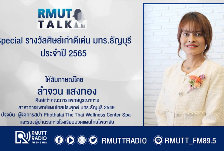 RMUT TALK l Special รางวัลศิษย์เก่าดีเด่น มทร.ธัญบุรี ประจำปี 2565 สัมภาษณ์ นางสาวลำจวน แสงทอง ศิษย์เก่าคณะการแพทย์บูรณาการ สาขาการแพทย์แผนไทยประยุกต์ มทร.ธัญบุรี 2549 ปัจจุบันดำรงตำแหน่ง ผู้จัดการสปา Phothalai The Thai Wellness Center Spa และรองผู้อำนวยการโรงเรียนนวดแผนไทยโพธาลัย รับฟังรายการได้ทาง FM 89.5 MHz วิทยุราชมงคลธัญบุรี ออกอากาศ วันที่ 12 ธันวาคม 2566 เวลา 14.00 – 14.30 น. ผู้ดำเนินรายการ ...