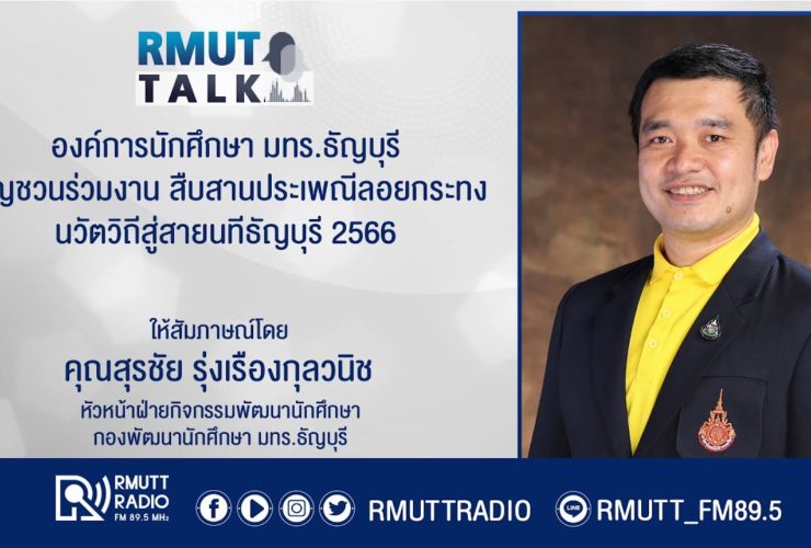 RMUT TALK l องค์การนักศึกษา มทร.ธัญบุรี เชิญชวนร่วมงาน สืบสานประเพณีลอยกระทง นวัตวิถีสู่สายนทีธัญบุรี 2566 สัมภาษณ์ คุณสุรชัย รุ่งเรืองกุลวนิช หัวหน้าฝ่ายกิจกรรมพัฒนานักศึกษา กองพัฒนานักศึกษา มทร.ธัญบุรี องค์การนักศึกษา มทร.ธัญบุรี เชิญชวนร่วมงาน สืบสานประเพณีลอยกระทง นวัตวิถีสู่สายนทีธัญบุรี 2566 ขอเชิญร่วมงานสืบสานประเพณีลอยกระทง “นวัตวิถีสู่สายนทีธัญบุรี ประจำปี ๒๕๖๖” ร่วมสักการะพระพุทธพิริยมงคล ชมการแสดงสุดอลังการ ตระการตา มีกิจกรรมการประกวดสุดยอดแห่งความปัง! มีร้านค้าให้เลือกซื้อของเยอะตลอดทั้งงาน งานวันที่ 25 – 30 พฤศจิกายน 2566 ณ มหาวิทยาลัยเทคโนโลยีราชมงคลธัญบุรี สำหรับรายละเอียดการรับสมัครและรายละเอียดกิจกรรมเพิ่มเติม สามารถกดติดตามผ่านเพจ ...