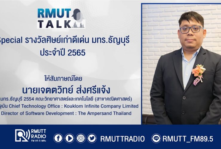 RMUT TALK l Special รางวัลศิษย์เก่าดีเด่น มทร.ธัญบุรี ประจำปี 2565 สัมภาษณ์ นายเจตตวิทย์ ส่งศรีแจ้ง ศิษย์เก่าสาขาคณิตศาสตร์ คณะวิทยาศาสตร์และเทคโนโลยี มทร.ธัญบุรี 2554 ปัจจุบันดำรงตำแหน่ง Chief Technology Office : Kouklom Infinite Company Limited Director of Software Development : The Ampersand Thailand รับฟังรายการได้ทาง FM 89.5 MHz วิทยุราชมงคลธัญบุรี ออกอากาศ วันที่ 29 ...