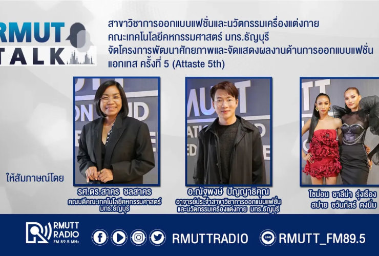 RMUT TALK l สาขาวิชาการออกแบบแฟชั่นและนวัตกรรมเครื่องแต่งกาย คณะเทคโนโลยีคหกรรมศาสตร์ มทร.ธัญบุรี จัดพิธีเปิดโครงการพัฒนาศักยภาพและจัดแสดงผลงานด้านการออกแบบแฟชั่น แอทเทส ครั้งที่ 5 (Attaste 5th) สัมภาษณ์ รศ.ดร.สาคร ชลสาคร คณบดีคณะเทคโนโลยีคหกรรมศาสตร์ มทร.ธัญบุรี อ.ณัฐพงษ์ ปัญญาธิคุณ อาจารย์ประจำสาขาวิชาการออกแบบแฟชั่นและนวัตกรรมเครื่องแต่งกาย คณะเทคโนโลยีคหกรรมศาสตร์ โซม่อน ชาลีน่า รุ่งเรือง 2nd Runner Up Miss Trans Thailand2023 สปาย ชวันภัสร์ คงนิ่ม Miss Earth Thailand 2022 ตัวแทนนักศึกษา สาขาวิชาการออกแบบแฟชั่นและนวัตกรรมเครื่องแต่งกาย คณะเทคโนโลยีคหกรรมศาสตร์ ...