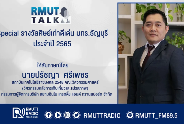 RMUT TALK l Special รางวัลศิษย์เก่าดีเด่น มทร.ธัญบุรี ประจำปี 2565 สัมภาษณ์ คุณ ปรัชญา ศรีเพชร ศิษย์เก่าวิศวกรรมหลังการเก็บเกี่ยวและแปรสภาพ คณะวิศวกรรมศาสตร์ สถาบันเทคโนโลยีราชมงคล 2548 ปัจจุบันดำรงตำแหน่ง กรรมการผู้จัดการบริษัท สยามอินโน เทรดดิ้ง แอนด์ ทรานสปอร์ต จำกัด รับฟังรายการได้ทาง FM 89.5 MHz วิทยุราชมงคลธัญบุรี ออกอากาศ วันที่ 28 พฤศจิกายน 2566 เวลา 14.00 – 14.30 น. ผู้ดำเนินรายการ อาทิตยา ...