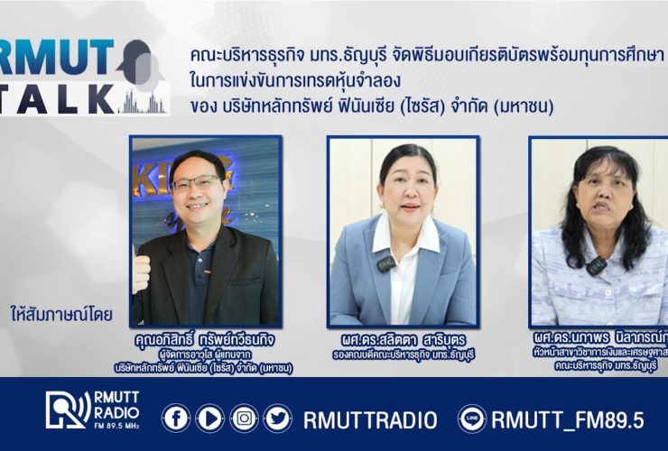 RMUT TALK l คณะบริหารธุรกิจ มทร.ธัญบุรี จัดพิธีมอบเกียรติบัตรพร้อมทุนการศึกษา ในการแข่งขันการเทรดหุ้นจำลอง ของ บริษัทหลักทรัพย์ ฟินันเซีย (ไซรัส) จำกัด (มหาชน) ช่วงที่ 2 สัมภาษณ์ คุณอภิสิทธิ์ ทรัพย์ทวีธนกิจ ผู้จัดการอาวุโส ผู้แทนจากบริษัทหลักทรัพย์ ฟินันเซีย (ไซรัส) จำกัด (มหาชน) ผู้ช่ายศาสตราจารย์ ดร.สลิตตา สาริบุตร รองคณบดีคณะบริหารธุกิจ มทร.ธัญบุรี ผศ.ดร.นภาพร นิลาภรณ์กุล หัวหน้าสาขาวิชาการเงินและเศรษฐศาสตร์ คณะบริหารธุกิจ มทร.ธัญบุรี ดร.ศุภโชค ถกลศรี อาจารย์ผู้รับผิดชอบโครงการส่งเสริมทักษะด้านการลงทุน และความรู้เกี่ยวกับตลาดทุนและตราสารหนี้ อ.นรเศรษฐ ศรีธานี ...
