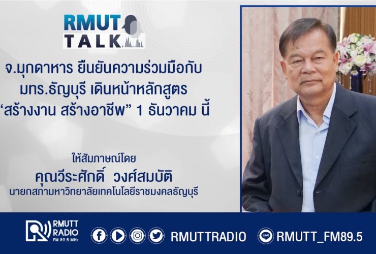 RMUT TALK l จ.มุกดาหาร ยืนยันความร่วมมือกับ มทร.ธัญบุรี เดินหน้าหลักสูตร สร้างงาน สร้างอาชีพ 1 ธันวาคม นี้ สัมภาษณ์ นายวีระศักดิ์ วงศ์สมบัติ นายกสภามหาวิทยาลัยเทคโนโลยีราชมงคลธัญบุรี จังหวัดมุกดาหาร ยืนยันความร่วมมือ กับ มหาวิทยาลัยเทคโนโลยีราชมงคลธัญบุรี พร้อม kick off หลักสูตร สร้างงานสร้างอาชีพ 1 ธันวาคม นี้ 6 ตุลาคม 2566 นายวรญาณ บุญณราช ผู้ว่าราชการจังหวัดมุกดาหาร พร้อมด้วย พ.ต.ท. จิตต์ ศรีโยหะมุกดาธนพงษ์ นายก.อบจ.มุกดาหาร นางอัญชลี ...