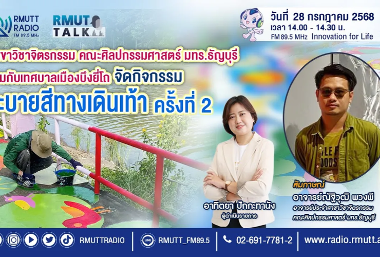 RMUT TALK l สาขาวิชาจิตรกรรม คณะศิลปกรรมศาสตร์ มทร.ธัญบุรี ร่วมกับเทศบาลเมืองบึงยี่โถ จัดกิจกรรมระบายสีทางเดินเท้า ครั้งที่ 2 สัมภาษณ์ อาจารย์ณัฐิวุฒิ พวงพี อาจารย์ประจำสาขาวิชาจิตรกรรม คณะศิลปกรรมศาสตร์ มทร.ธัญบุรี สาขาวิชาจิตรกรรม คณะศิลปกรรมศาสตร์ มหาวิทยาลัยเทคโนโลยีราชมงคลธัญบุรี (มทร.ธัญบุรี) ร่วมกับ เทศบาลเมืองบึงยี่โถ จัดกิจกรรมระบายสีทางเดินเท้า ครั้งที่ 2 ระหว่างวันที่ 10 – 13 กรกฎาคม 2568 โดยมีนักศึกษาสาขาจิตรกรรม คณะศิลปกรรมศาสตร์ ชั้นปีที่ 1 – 4 จำนวน 50 คน ...