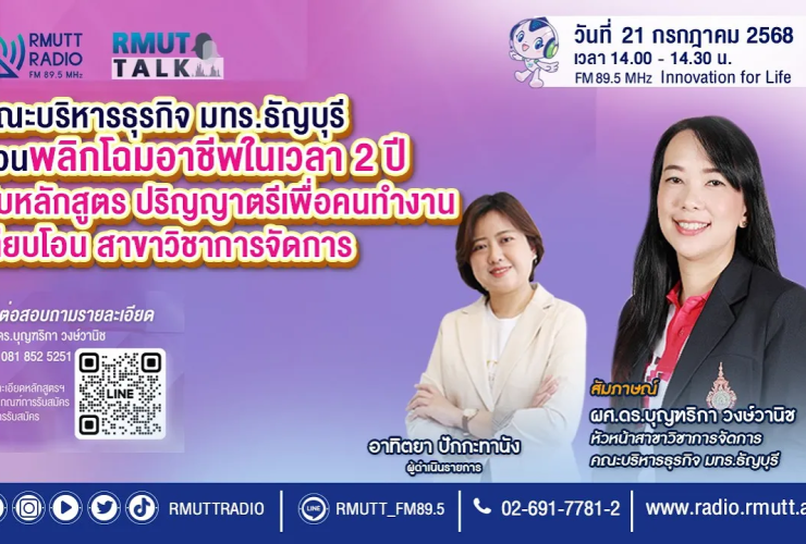 RMUT TALK l คณะบริหารธุรกิจ ชวนพลิกโฉมอาชีพในเวลา 2 ปี กับหลักสูตรปริญญาตรีเพื่อคนทำงาน เทียบโอน สาขาวิชาการจัดการ สัมภาษณ์ ผศ.ดร.บุญฑริกา วงษ์วานิช หัวหน้าสาขาวิชาการจัดการ คณะบริหารธุรกิจ มทร.ธัญบุรี คณะบริหารธุรกิจ มหาวิทยาลัยเทคโนโลยีราชมงคลธัญบุรี (มทร.ธัญบุรี) ชวนพลิกโฉมอาชีพของคุณในเวลาเพียง 2 ปี กับหลักสูตรปริญญาตรี เทียบโอน สาขาวิชาการจัดการ วิชาเอกนวัตกรรมการจัดการธุรกิจ เรียนวันอาทิตย์เพียงวันเดียว เป็นหลักสูตรที่เหมาะสำหรับคนทำงานที่เรียนจบ ปวส. สาขาที่เกี่ยวข้องกับการบริหารธุรกิจ พร้อมก้าวสู่บทบาท ผู้จัดการโครงการ HR นักวิเคราะห์ธุรกิจ ผู้พัฒนาธุรกิจ และผู้ประกอบการ . ผู้เข้าเรียนจะได้เพิ่มศักยภาพด้านการจัดการจากเจ้าของประสบการณ์จริงในวงการธุรกิจ เรียนรู้เทคนิค นวัตกรรมการจัดการธุรกิจที่นำไปใช้ได้จริง ...
