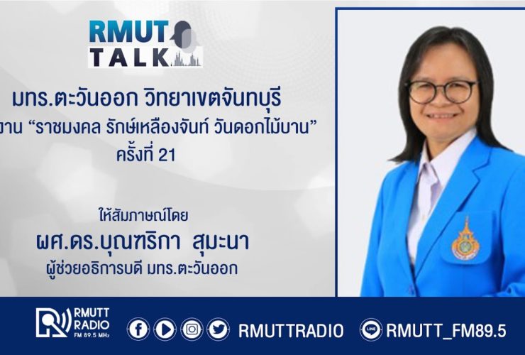 RMUT TALK l มทร.ตะวันออก วิทยาเขตจันทบุรี จัดงาน “ราชมงคล รักษ์เหลืองจันท์ วันดอกไม้บาน ครั้งที่ 21” . สัมภาษณ์ ผศ.ดร.บุณฑริกา สุมะนา ผู้ช่วยอธิการบดี มทร.ตะวันออก มทร.ตะวันออก วิทยาเขตจันทบุรี จัดงาน “ราชมงคล รักษ์เหลืองจันท์ วันดอกไม้บาน ครั้งที่ 21” ประจำปี 2566 โดยในปีนี้ กำหนดจัดงานขึ้นในวันที่ 11 – 19 กุมภาพันธ์ 2566 เพื่อส่งเสริมการอนุรักษ์กล้วยไม้พันธุ์พื้นเมือง “เหลืองจันทบูร” ให้มีการขยายพันธุ์อย่างแพร่หลายมากยิ่งขึ้น อีกทั้งเป็นการเผยแพร่ผลงานวิจัยที่โดดเด่น ผลงานทางวิชาการ และผลงานเทคโนโลยีนวัตกรรมต่าง ...