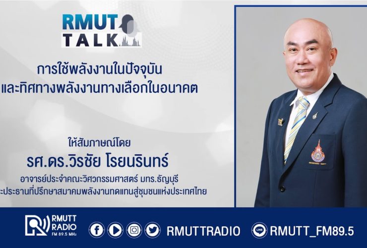 RMUT TALK l การใช้พลังงานในปัจจุบันและทิศทางพลังงานทางเลือกในอนาคต . สัมภาษณ์ รศ.ดร.วิรชัย โรยนรินทร์ อาจารย์ประจำคณะวิศวกรรมศาสตร์ และประธานที่ปรึกษาสมาคมพลังงานทดแทนสู่ชุมชนแห่งประเทศไทย . การใช้พลังงานในปัจจุบัน และทิศทางการใช้พลังงานทางเลือกในอนาคต การผลิตพลังงานยังคงเป็นหนึ่งในสิ่งจำเป็น ที่ผ่านมาการเข้ามาของเทคโนโลยีใหม่ๆ ที่จะทำให้เกิดการเปลี่ยนแปลง และการแทนที่รูปแบบเทคโนโลยีแบบเดิมที่พัฒนาและใช้กันมาเป็นเวลาหลายทศวรรษ . แนวโน้มการทดแทนของการใช้พลังงาน (พลังงานทดแทน) ในอนาคตเป็นอย่างไร ผลกระทบด้านพลังงานที่มีต่อประชาชนทั้งทางตรงและทางอ้อม สามารถติดตามข่าวสารของทาง สมาคมพลังงานทดแทนสู่ชุมชนแห่งประเทศไทย ได้ทางหมายเลขโทรศัพท์ 02 549 3497 และ www.facebook.com/ThailandRECA หรือดูรายละเอียดได้ที่ http://reca.or.th . รับฟังรายการได้ทาง FM 89.5 MHz วิทยุราชมงคลธัญบุรี ออกอากาศ วันที่ ...