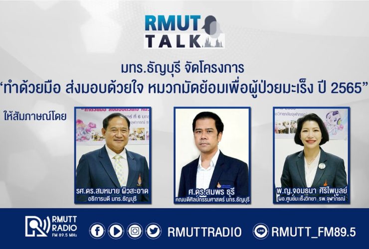 RMUT TALK l มทร.ธัญบุรี จัดโครงการ “ทำด้วยมือ ส่งมอบด้วยใจ หมวกมัดย้อมเพื่อผู้ป่วยมะเร็ง ปี 2565” . สัมภาษณ์ รศ.ดร.สมหมาย ผิวสะอาด อธิการบดี มทร.ธัญบุรี ศ.ดร.สมพร ธุรี คณบดีศิลปกรรมศาสตร์ พ.ญ.จอมธนา ศิริไพบูลย์ ผอ.ศูนย์มะเร็งวิทยา รพ.จุฬาภรณ์ . วันที่ 6 มกราคม 2566 รศ.ดร.สมหมาย ผิวสะอาด อธิการบดีมหาวิทยาลัยเทคโนโลยีราชมงคลธัญบุรี เป็นประธานเปิดโครงการ “ทำด้วยมือ ส่งมอบด้วยใจ หมวกมัดย้อมเพื่อผู้ป่วยมะเร็ง ปี 2565” ณ โรงพยาบาลจุฬาภรณ์ ราชวิทยาลัยจุฬาภรณ์ ...