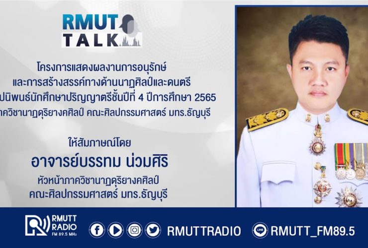 RMUT TALK l โครงการแสดงผลงานการอนุรักษ์และการสร้างสรรค์ทางด้านนาฏศิลป์และดนตรี ศิลปนิพนธ์นักศึกษาปริญญาตรีชั้นปีที่ 4 ปีการศึกษา 2565 ภาควิชานาฏดุริยางคศิลป์ คณะศิลปกรรมศาสตร์ มทร.ธัญบุรี . สัมภาษณ์ อาจารย์ บรรทม น่วมศิริ หัวหน้าภาควิชานาฏดุริยางคศิลป์ คณะศิลปกรรมศาสตร์ มทร.ธัญบุรี ภาควิชานาฏสุริยางคศิลป์ คณะศิลปกรรมศาสตร์ มทร.ธัญบุรี จัดโครงการแสดงผลงานการอนุรักษ์และการสร้างสรรค์ทางด้านนาฎศิลป์และดนตรีศิลปนิพนธ์ของนักศึกษาชั้นปีที่ 4 ปีการศึกษา 2565 “นวัตนาฏดนตรี มทร.ธัญบุรี สู่การเรียนรู้ (เหยียบเรือสองแคม)” . เพื่อเป็นการนำเสนอผลงานนักศึกษาอันเกิดจากการศึกษาองค์ความรู้ทางด้านนาฏศิลป์และดนตรีนำมาบูรณาการและพัฒนาศักยภาพทางการศึกษา โดยมีวัตถุประสงค์เพื่อสืบทอดศิลปวัฒนธรรม ภูมิปัญญา นำมาสร้างองค์ความรู้ เผยแพร่ผลงานการแสดงนาฏศิลป์และดนตรี สร้างประสบการณ์ทางด้านการแสดงแก่นักศึกษา โดยในงานนี้ยังได้รับความอนุเคราะห์จากคณะกรรมการผู้ทรงคุณวุฒิ ในสาขานาฏศิลป์ไทย ดุริยางค์ไทยและคีตศิลป์ไทย ...