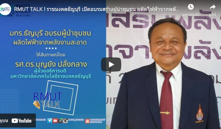 RMUT TALK l ราชมงคลธัญบุรี เปิดอบรมสร้างผู้นำชุมชน ผลิตไฟฟ้าจากพลังงานสะอาด . สัมภาษณ์ รศ.ดร.บุญยัง ปลั่งกลาง ตำแหน่ง ผู้ช่วยอธิการบดี มหาวิทยาลัยเทคโนโลยีราชมงคลธัญบุรี . รศ.ดร.บุญยัง ปลั่งกลาง ผู้ช่วยอธิการบดี มหาวิทยาลัยเทคโนโลยีราชมงคลธัญบุรี ในฐานะหัวหน้าโครงการฯ เปิดเผยถึงวัตถุประสงค์การจัดโครงการฯ นี้ว่า จะเป็นการสร้างผู้เชี่ยวชาญในการผลิตไฟฟ้าจากพลังงานสะอาดให้กับตัวแทนชุมชนองค์กรส่วนท้องถิ่น ใน 5 เขตพื้นที่ ทั้งภาคกลาง ภาคเหนือ อีสาน ตะวันออก และ ใต้ พื้นที่ละ 100 คน รวม 500 คน เพื่อให้ทุกคนได้เข้าใจถึง พลังงานแสงอาทิตย์ และ ...