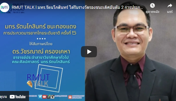 RMUT TALK l มทร.รัตนโกสินทร์ ได้รับรางวัลรองชนะเลิศอันดับ 2 การประกวดมารยาทไทยระดับชาติ ครั้งที่ 5 . สัมภาษณ์ ดร.วัชรฌาณ์ ครองเคหา อาจารย์ประจำสาขาวิชาศึกษาทั่วไป คณะศิลปศาสตร์ มทร.รัตนโกสินทร์ . เมื่อวันที่ 30 มกราคม 2565 คณะศิลปศาสตร์ มหาวิทยาลัยเทคโนโลยีราชมงคลรัตนโกสินทร์ พื้นที่บพิตรพิมุข จักรวรรดิ โดยอาจารย์ดร.วัชรฌาณ์ ครองเคหา และอ.รุ่งฤดี นาอ่อน ได้นำนักศึกษา คณะศิลปศาสตร์ เข้าร่วมการประกวดมารยาทไทยระดับชาติ ครั้งที่ 5 ระดับอุดมศึกษา ถ้วยพระราชทานสมเด็จพระกนิษฐาธิราชเจ้า กรมสมเด็จพระเทพรัตน์ราชสุดาฯ สยามบรมราชกุมารี ณ ห้องประชุมสมเด็จพระบรมไตรโลกนาถ ...