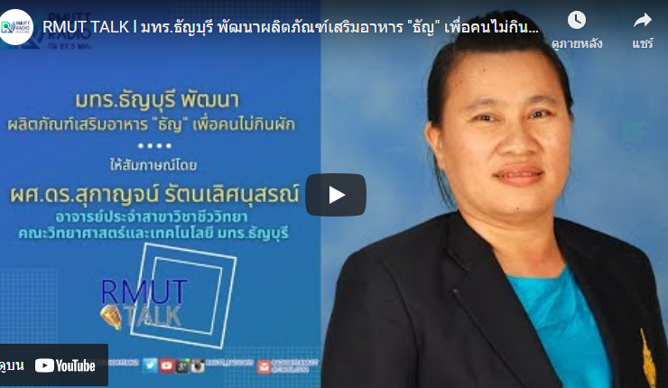 RMUT TALK l มทร.ธัญบุรีพัฒนาผลิตภัณฑ์เสริมอาหาร “ธัญ” เพื่อคนไม่กินผัก . สัมภาษณ์ ผศ.ดร.สุกาญจน์ รัตนเลิศนุสรณ์ อาจารย์ประจำสาขาวิชาชีววิทยา คณะวิทยาศาสตร์และเทคโนโลยี มทร.ธัญบุรี . ผู้ช่วยศาสตราจรย์ ดร.สุกาญจน์ รัตนเลิศนุสรณ์ อาจารย์ประจำสาขาวิชาชีววิทยา คณะวิทยาศาสตร์และเทคโนโลยี มทร.ธัญบุรี เผยว่า ผลิตภัณฑ์เสริมอาหาร ตรา ธัญ ผงเคล ผสม ผงแอปเปิ้ล ผงกีวี สารสกัดอะเซโรลาเชอร์รี่ ไตรเปบไทด์คลอลาเจน และวิตามินบี เป็นการสนับสนุนให้เกษตรกรชุมชนบึงบา ได้พัฒนาการปลูกผักสลัดมาตรฐานอินทรีย์ไทย เพื่อเพิ่มผลผลิตให้มากขึ้นกว่าปกติ กลุ่มเกษตรกรรวมกลุ่มกันเพื่อปลูกผักส่งวิสาหกิจชุมชนนำไปแปรรูปเป็นผักแห้ง ก่อนสกัดเป็นสารสกัดออกฤทธิ์เข้มข้น สำหรับนำไปเป็นส่วนผสมผลิตภัณฑ์ผงเคลผสมผักผลไม้ เพื่อให้ผู้บริโภคที่ไม่ชอบทานผัก ได้รับประทานอาหารเสริมที่มีคุณภาพของโปรตีนมากกว่าปกติ ผู้สนใจสามารถติดต่อได้ที่ ...