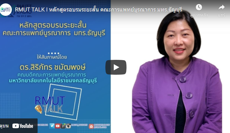 RMUT TALK I หลักสูตรอบรมระยะสั้น คณะการแพทย์บูรณาการ มทร.ธัญบุรี . สัมภาษณ์ ดร.สิริภัทร ชมัฒพงษ์ ตำแหน่ง คณบดีคณะการแพทย์บูรณาการ มหาวิทยาลัยเทคโนโลยีราชมงคลธัญบุรี . คณะการแพทย์บูรณาการ มหาวิทยาลัยเทคโนโลยีราชมงคลธัญบุรี ดำเนินโครงการบริการวิชาการ ประจำปี 2564 – 2565 และกำหนดจัดหลักสูตรอบรมระยะสั้นจัดอบรมแก่ผู้สนใจทั่วไป จำนวน 4 หลักสูตร ในระหว่างเดือน พฤศจิกายน – ธันวาคม 2564 ได้แก่ 1. เทคนิคการใช้ลูกประคบหน้าเพื่อความงาม 2. เทคนิคการนวดนักกีฬาขั้นพื้นฐาน Basic Sport Massage Technique 3. ...