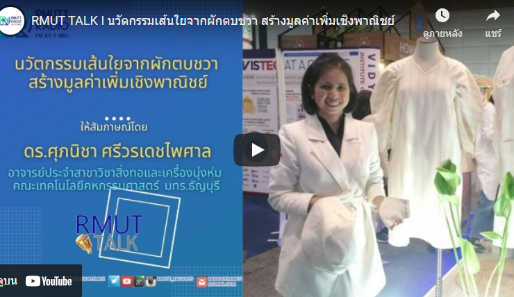 RMUT TALK I นวัตกรรมเส้นใยจากผักตบชวา สร้างมูลค่าเพิ่มเชิงพาณิชย์ . สัมภาษณ์ ดร.ศุภนิชา ศรีวรเดชไพศาล ตำแหน่ง อาจารย์ประจำสาขาวิชาสิ่งทอและเครื่องนุ่งห่ม คณะเทคโนโลยีคหกรรมศาสตร์ มหาวิทยาลัยเทคโนโลยีราชมงคลธัญบุรี . นวัตกรรมเส้นใยจากผักตบชวา ทางทีมวิจัยได้ของบประมาณจาก สำนักงานการวิจัยแห่งชาติ หรือ วช.สำหรับการดำเนินการในปีแรก ผลิตเป็นเส้นด้ายและผ้าจากผักตบชวาขึ้นมาก่อน จนกระทั่งปี 2563 ได้งบจาก ปตท. สนับสนุนให้มีการนำองค์ความรู้ลงไปสู่ชุมชนให้ชุมชนได้ใช้ ตอนนั้นมีผ้าแล้ว ก็นำผ้านี้ไปถ่ายทอดให้เขาเพื่อเป็นอีกทางเลือกที่นอกจากผ้าไทยที่เขาจะหาซื้อได้ทั่วไปแล้ว ให้สามารถใช้ผ้าผักตบไปผลิตเป็นรูปแบบผลิตภัณฑ์ชุมชนได้ . ทางวิทยุราชมงคลธัญบุรี FM 89.5 MHz ...