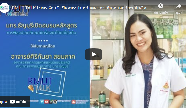 RMUT TALK l มทร.ธัญบุรี เปิดอบรมในหลักสูตร การพิสูจน์เอกลักษณ์เครื่องยาไทยเบื้องต้น . สัมภาษณ์ อ.ศิริกันยา สยมภาค อาจารย์สาขาการแพทย์แผนไทยประยุกต์ คณะการแพทย์บูรณาการ มทร.ธัญบุรี . การอบรมในหลักสูตร “การพิสูจน์เอกลักษณ์เครื่องยาไทยเบื้องต้น” ผู้เข้าร่วมอบรมจะได้รับความรู้เรื่องการพิจารณาเครื่องยาสมุนไพร และการตรวจสอบเอกลักษณ์แบบมหทรรศน์ เช่น การพิจารณาลักษณะ สี กลิ่น ของสมุนไพรแต่ละชนิด เพื่อช่วยในการจำแนกชนิดของสมุนไพรทั้ง พืชวัตถุ ธาตุวัตถุ และสัตว์วัตถุ มากกว่า 200 ชนิด และผู้เข้ารับการอบรมจะได้รับตัวอย่างสมุนไพร 30 ชนิด จัดส่งให้ถึงบ้าน โดยการอบรมนี้เหมาะสำหรับผู้เตรียมสอบใบประกอบวิชาชีพการแพทย์แผนไทยประยุกต์ ใบประกอบวิชาชีพการแพทย์แผนไทย สาขาเภสัชกรรมไทย และผู้ที่สนใจทั่วไป จะจัดอบรมในวันที่ 22 ...
