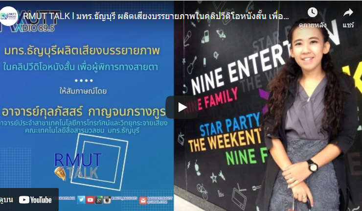 RMUT TALK l มทร.ธัญบุรี ผลิตเสียงบรรยายภาพในคลิปวีดิโอหนังสั้น เพื่อผู้พิการทางสายตา . สัมภาษณ์ อาจารย์กุลภัสสร์ กาญจนภรางกูร อาจารย์ประจำสาขาเทคโนโลยีการโทรทัศน์และวิทยุกระจายเสียง คณะเทคโนโลยีสื่อสารมวลชน มทร.ธัญบุรี . คณะเทคโนโลยีสื่อสารมวลชน มทร.ธัญบุรี เสนอผลงาน “ผลิตเสียงบรรยายภาพในคลิปวีดิโอหนังสั้น เพื่อผู้พิการทางสายตา” โลกกำลังก้าวไปข้างหน้าด้วยวิทยาศาสตร์และเทคโนโลยีที่พัฒนาไปอย่างไม่มีขีดจำกัด เพื่อตอบสนองความต้องการและความสะดวกสบายของมนุษย์ผู้ใช้งานยุคไอที ในขณะที่ผู้พัฒนาบางส่วนได้ลืมไปว่าในสังคมนี้ยังมี “ผู้พิการทางสายตา” ที่ต้องการนวัตกรรมขั้นพื้นฐานสำหรับการดำเนินชีวิตเหมือนคนปกติทั่วไป โทรทัศน์ ก็ถือเป็นอีกหนึ่งสื่อที่ทำให้ผู้ชมสามารถรับชมและรับฟังข้อมูลข่าวสาร ความรู้ และความบันเทิงได้กับผู้ชมทุกเพศทุกวัย และในปัจจุบันได้มีการเปลี่ยนรูปแบบให้สามารถรับชมได้ทางออนไลน์ ผ่านทางเว็บไซต์ บนจอมือถือ บนแท็บเลต และอุปกรณ์คอมพิวเตอร์อื่น ๆ ทำให้ผู้ชมสามารถรับชมรายการโทรทัศน์ได้สะดวก รวดเร็ว และตรงกับความต้องการของแต่ละคนมากขึ้น แต่เคยสงสัยไหมว่าผู้พิการทางสายตา ดูโทรทัศน์อย่างไร เมื่อผู้พิการทางสายตารับชมรายการโทรทัศน์ ...