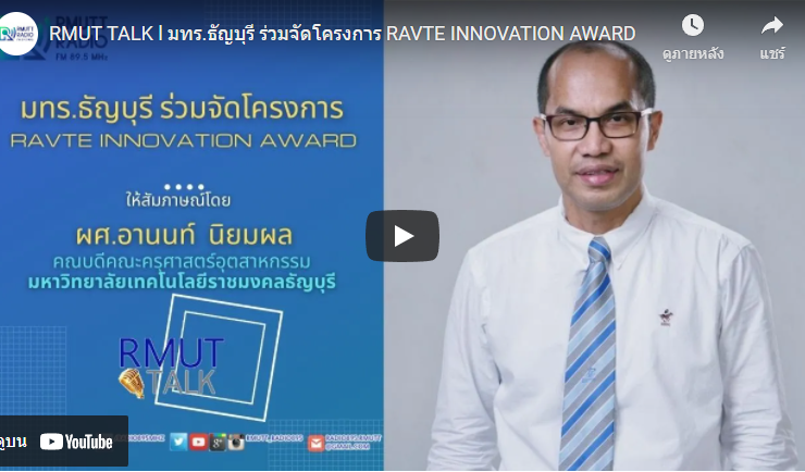 RMUT TALK l มทร.ธัญบุรี ร่วมจัดโครงการ RAVTE INNOVATION AWARD เปิดรับนักศึกษาส่งผลงานเข้าร่วมประกวดสิ่งประดิษฐ์นวัตกรรม สัมภาษณ์ ผศ.อานนท์ นิยมผล คณบดีคณะครุศาสตร์อุตสาหกรรม มทร.ธัญบุรี . โครงการ RAVTE INNOVATION AWARD เปิดรับนักศึกษาส่งผลงานเข้าร่วมประกวดสิ่ประดิษฐ์นวัตกรรม โดยคุณสมบัติผู้สมัครต้องเป็น นักศึกษาระดับปริญญาตรีทุกสาขา และนักศึกษาสามารถเข้าร่วมเป็นทีม หรือรายบุคคลได้ ลักษณะผลงาน 1. Ready-made article (ขึ้นงานที่สำเร็จรูป) 2. Prototype (ต้นแบบ) การส่งผลงานสิ่งประดิษฐ์เพื่อเข้าร่วมประกวด 1. ส่งแบบตอบรับการเข้าร่วมโครงการฯ 2. จัดทำเอกสารร่ายละเอียดผลงานตามแบบฟอร์มที่กำหนด สรุปข้อมูลโดยย่อของผลงานฯ และหนังสือยืนยันความเป็นเจ้าของผลงานสิ่งประดิษฐ์ จำนวน ...