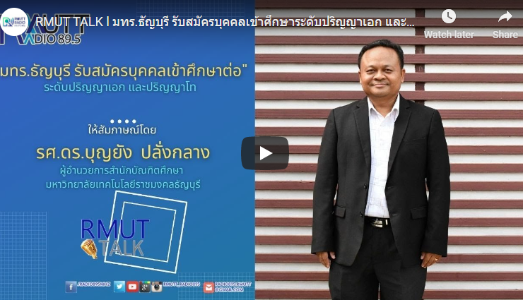 RMUT TALK l มทร.ธัญบุรี รับสมัครบุคคลเข้าศึกษาระดับปริญญาเอก และปริญญาโท สัมภาษณ์ รศ.ดร.บุญยัง ปลั่งกลาง ผู้อำนวยการสำนักบัณฑิตศึกษา มหาวิทยาลัยเทคโนโลยีราชมงคลธัญบุรี มทร.ธัญบุรี รับสมัครบุคคลเข้าศึกษาในระดับปริญญาเอก และปริญญาโท ผู้สมัครสามารถดูรายละเอียดและดาวน์โหลดระเบียบการสอบคัดเลือกเข้าศึกษาระดับปริญญาเอกและระดับปริญญาโท ภาคการศึกษาที่ 1 ปีการศึกษา 2564 จากเว็บไซต์ www.grad.rmutt.ac.th ผู้สมัครกรอกข้อมูลการสมัครในเว็บไซต์ www.grad.rmutt.ac.th (ในระบบรับสมัคร) ให้ถูกต้อง ครบถ้วน สอบถามรายละเอียดเพิ่มเติมสำนักบัณฑิตศึกษา โทร 02 549 3697 ...