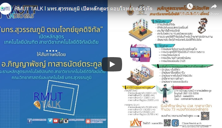 RMUT TALK l มทร.สุวรรณภูมิ ตอบโจทย์ยุคดิจิทัล เปิดหลักสูตร เทคโนโลยีบัณฑิต สาขาวิชาเทคโนโลยีดิจิทัลมีเดีย . สัมภาษณ์ อ.ภิญญาพัชญ์ ทาสาธนัตย์ตระกูล ประธานหลักสูตรเทคโนโลยีบัณฑิต สาขาวิชาเทคโนโลยีดิจิทัลมีเดีย คณะวิทยาศาสตร์และเทคโนโลยี มทร.สุวรรณภูมิ . มทร.สุวรรณภูมิ เปิดหลักสูตรเทคโนโลยีบัณฑิต สาขาวิชาเทคโนโลยีดิจิทัลมีเดีย(ต่อเนื่อง) ตอบโจทย์ยุคดิจิทัล สำหรับการเรียนการสอนจะเน้นการผลิตสื่อดิจิทัล การผลิตกราฟฟิก เกมส์กีฬาอิเล็กทรอนิกส์ เทคโนโลยีเสมือนจริง การพัฒนาโปรแกรมประยุกต์ เป็นต้น เมื่อจบการศึกษาในหลักสูตรดังกล่าวสามารถประกอบอาชีพเป็นนักพัฒนาสื่อดิจิทัล นักวิชาการศึกษา นักพัฒนาเกมส์และแอนิเมชั่น เป็นต้น ผู้ที่สนใจสอบถามข้อมูลได้ที่ อาจารย์ภิญญาพัชญ์ ทาสาธนัตย์ตระกูล 092 551 9356 ...