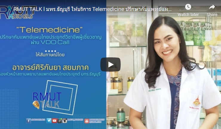 RMUT TALK l มทร.ธัญบุรี ให้บริการ Telemedicine ปรึกษากับแพทย์แผนไทยประยุกต์วิชาชีพผู้เชี่ยวชาญ ผ่าน VDO Call สัมภาษณ์ อ.ศิริกันยา สยมภาค รองหัวหน้าสถานพยาบาลแพทย์แผนไทยประยุกต์ มทร.ธัญบุรี สถานพยาบาลการแพทย์แผนไทยประยุกต์ มทร.ธัญบุรี – ศูนย์รังสิต ให้บริการ Telemedicine ปรึกษากับแพทย์แผนไทยประยุกต์วิชาชีพผู้เชี่ยวชาญ ผ่าน VDO Call สำหรับผู้ป่วยและญาติที่ไม่สะดวกมารับบริการ ณ สถานพยาบาลฯ สามารถรับคำปรึกษาได้ทุกเวลา โดยไม่มีค่าใช้จ่าย และหากไม่สะดวกมารับยา เราส่งยาถึงบ้าน การให้คำแนะนำและบริการทางการแพทย์แผนไทยนี้ เป็นไปในกรอบจำกัดตามข้อมูลที่แพทย์แผนไทยประยุกต์วิชาชีพได้รับจากผู้รับบริการ และอาจไม่ได้จัดว่าเป็นการวินิจฉัยทางการแพทย์ และไม่สามารถให้บริการในกรณีเจ็บป่วยฉุกเฉินที่ต้องการการรักษาทางการแพทย์เร่งด่วน เริ่มให้บริการ ตั้งแต่วันที่ 4 มกราคม ...