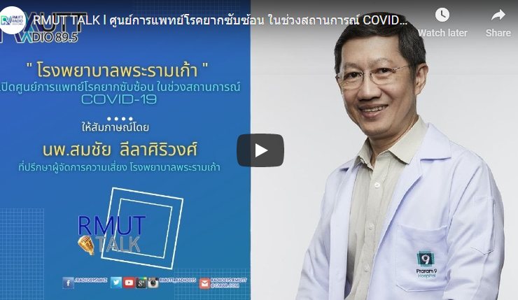RMUT TALK l ศูนย์การแพทย์โรคยากซับซ้อน ในช่วงสถานการณ์ COVID-19 สัมภาษณ์ นพ.สมชัย ลีลาศิริวงศ์ ที่ปรึกษาผู้จัดการความเสี่ยง โรงพยาบาลพระรามเก้า โรงพยาบาลพระรามเก้า เราจึงถือโอกาสนี้เปิดอาคารใหม่ในชื่อ “ศูนย์การแพทย์พระรามเก้า” เป็นศูนย์รวมทางการแพทย์ด้านไลฟ์สไตล์เพื่อขยายฐานสู่คนรุ่นใหม่ เน้นให้ความสำคัญกับการดูแลสุขภาพก่อนป่วย และปัญหาสุขภาพของคนสมัยใหม่ที่มีสาเหตุมาจาก Lifestyle อย่าง Office Syndrome บาดเจ็บจากการเล่นกีฬา หรือปัญหาความเครียด โดยมีสถาบัน Fix & Fit เป็นศูนย์รวมการดูแลสุขภาพที่ตอบทุก lifestyle problems สอบถามเพิ่มเติมโทร 02 202 9999 ...