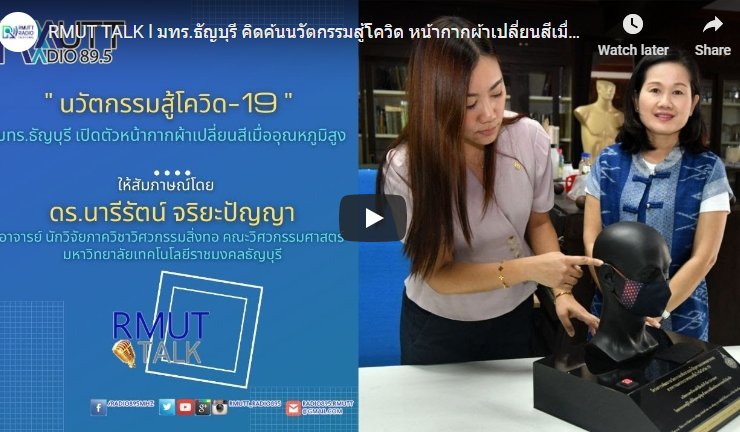 RMUT TALK l มทร.ธัญบุรี คิดค้นนวัตกรรมสู้โควิด หน้ากากผ้าเปลี่ยนสีเมื่ออุณหภูมิสูง สัมภาษณ์ ดร.นารีรัตน์ จริยะปัญญา อาจารย์นักวิจัยภาควิชาวิศวกรรมสิ่งทอ สาขาวิศวกรรมการจัดการผลิตภัณฑ์สิ่งทอ คณะวิศวกรรมศาสตร์ มหาวิทยาลัยเทคโนโลยีราชมงคลธัญบุรี ดร.นารีรัตน์ จริยะปัญญา อาจารย์นักวิจัยภาควิชาวิศวกรรมสิ่งทอ สาขาวิศวกรรมการจัดการผลิตภัณฑ์สิ่งทอ คณะวิศวกรรมศาสตร์ มหาวิทยาลัยเทคโนโลยีราชมงคลธัญบุรี (มทร.ธัญบุรี) เผยว่า ตนและ ทีมวิจัยได้ร่วมกันพัฒนานวัตกรรมหน้ากากเปลี่ยนสีไปเมื่อผู้สวมใส่เมื่อมีอุณหภูมิสูง ด้วยการพัฒนาชิ้นส่วนหน้ากากและแถบยางยืด (Elastic Band) เคลือบตกแต่งด้วยสารเทอร์โมโครมิก โดยเมื่อผู้สวมใส่มีอุณหภูมิร่างกายสูงประมาณ 37.5 องศาเซลเซียส สีของสารเทอร์โมโครมิกบนหน้ากากและยางยืด จะเปลี่ยนเป็นไม่มีสีและแสดงสีเดิมของเนื้อผ้า ผู้สนใจสามารถสอบถามข้อมูลเพิ่มเติม โทร.02 549 3450 ...