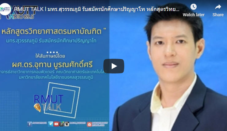 RMUT TALK l มทร.สุวรรณภูมิ รับสมัครนักศึกษาปริญญาโท หลักสูตรวิทยาศาสตรมหาบัณฑิต สาขาวิชาเทคโนโลยีดิจิทัลมีเดีย สัมภาษณ์ ผศ.ดร.อุทาน บูรณศักดิ์ศรี อาจารย์ประจำสาขาวิทยาการคอมพิวเตอร์ คณะวิทยาศาสตร์และเทคโนโลยี มทร.สุวรรณภูมิ มทร.สุวรรณภูมิ รับสมัครนักศึกษาหลักสูตรปริญญาโท หลักสูตรวิทยาศาสตรมหาบัณฑิต สาขาวิชาเทคโนโลยีดิจิทัลมีเดีย จำนวนไม่น้อยกว่า 36 หน่วยกิต ภาคสมทบ เรียนทุกวันเสาร์-อาทิตย์ คุณสมบัติ สำเร็จการศึกษา ระดับปริญญาตรี ไม่จำกัดสาขาวิชา ค่าใช้จ่ายหลักสูตร 2 ปี ตลอดหลักสูตรรวม 179,800 บาท ผู้สนใจ สามารถติดต่อสอบถามข้อมูลที่ ดร.สุวุฒิ ตุ้มทอง 099-5815564 หรือ ผศ.ดร.อุทาน บูรณศักดิ์ศรี ...